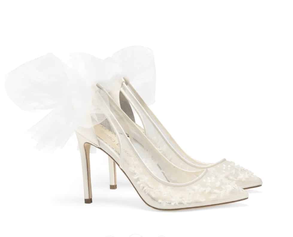 These beaded wedding shoes feature elegant lace floral patterns on ivory illusion mesh. A removable oversized tulle bow at the back adds flair for more dramatic bridal ensembles. A cutout at Edna’s upper completes these high heel beaded shoes for wedding glamour.