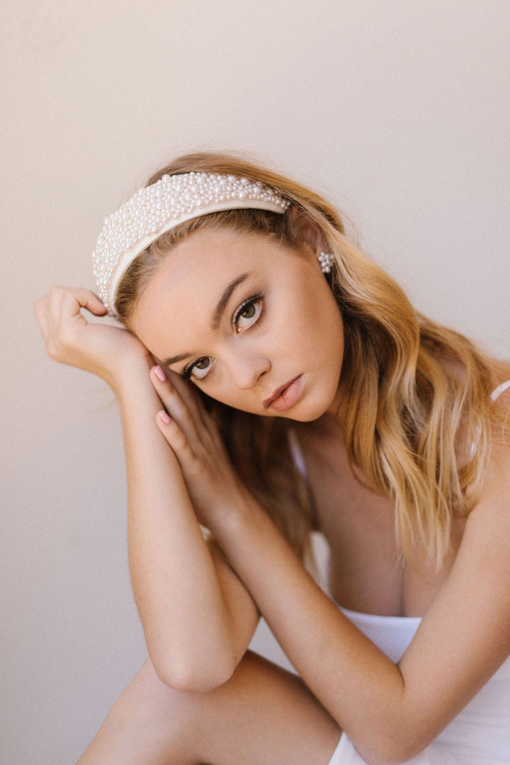 This stunner needs no introduction. Fool-proof styling– this white fabric headband is filled with different size pearls. We love this one!!!