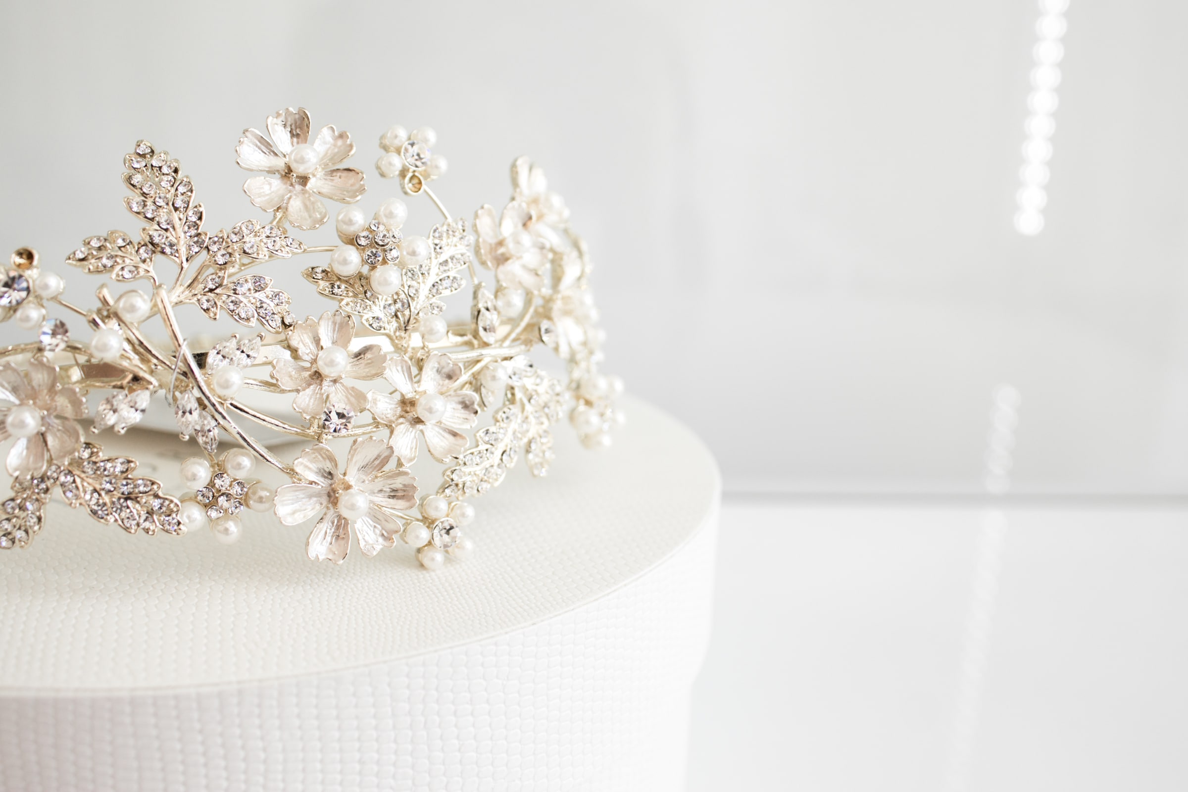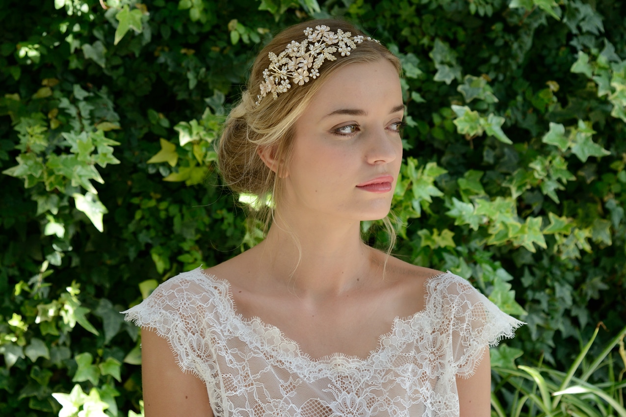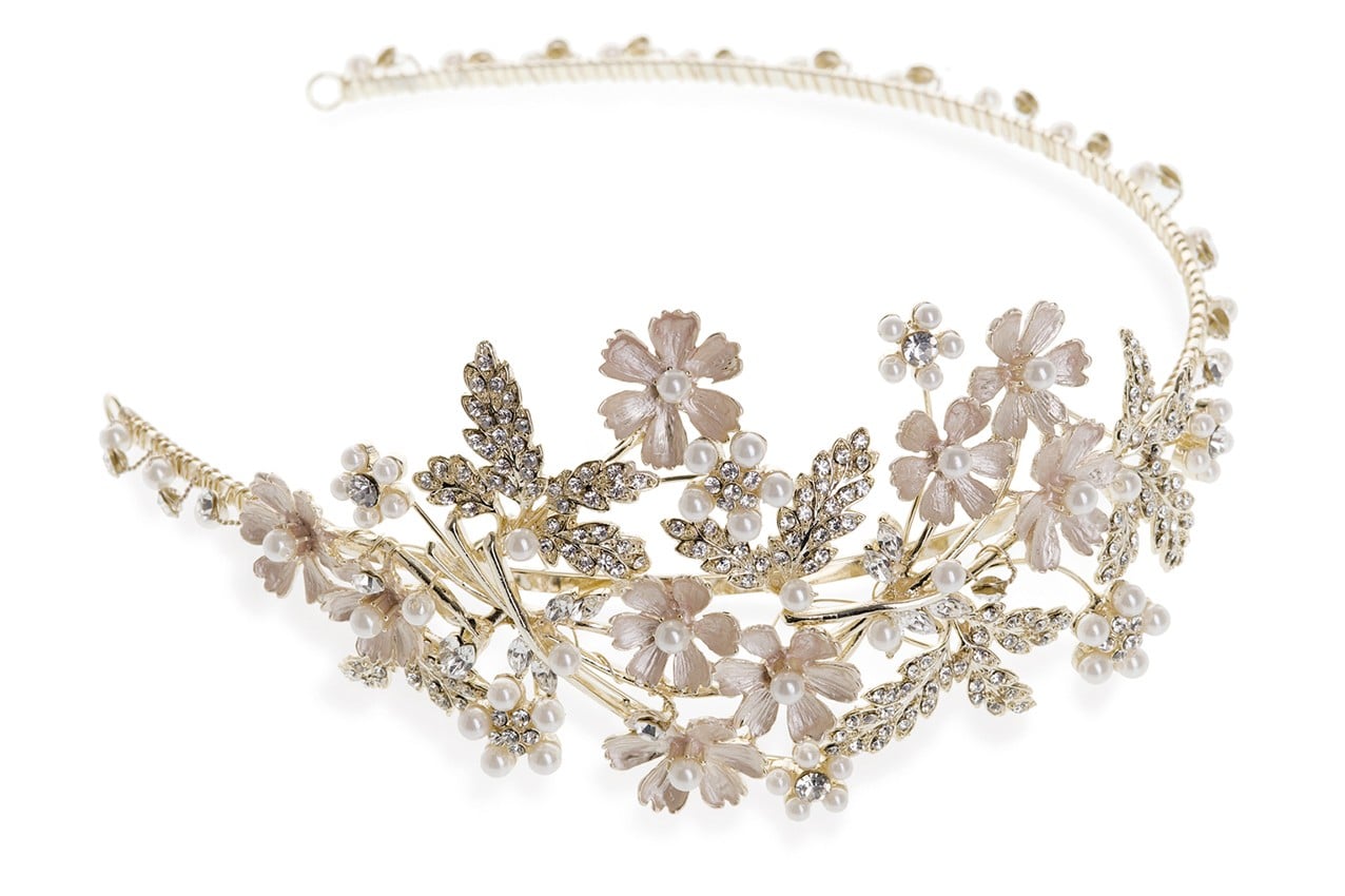Mimosa is a pretty and delicate headpiece – dazzling solitaire cut stones are set in an intricate pattern of hand enamelled flowers and pale gold leaves on the side of the band and are interspersed with natural manmade ivory pearls. This is an elegant design which can be worn with classic style wedding dresses or would also be perfect with bohemian style gowns too.