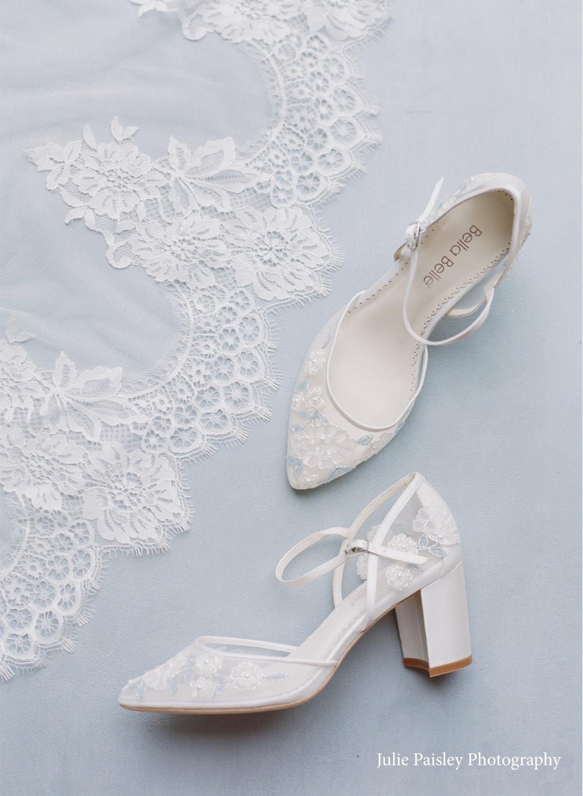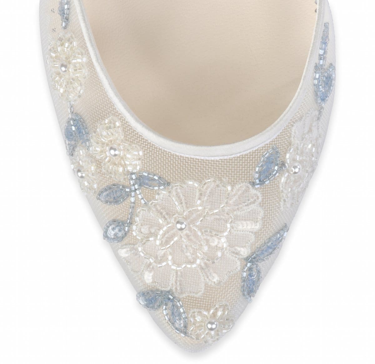 A touch of ‘something blue’ comes in baby blue leaves embroidered with beads in this ethereal block heel. Intertwined with beaded ivory flower buds, hand sewn with beads and classic pearl on comfortable mesh. The Vivian block heel is all romantic, elegant and feminine that has a touch of color to an ivory wedding ensemble. Add an ankle strap for a secure finish and you get a comfortable and stylish wedding heel. You can now walk on grass!